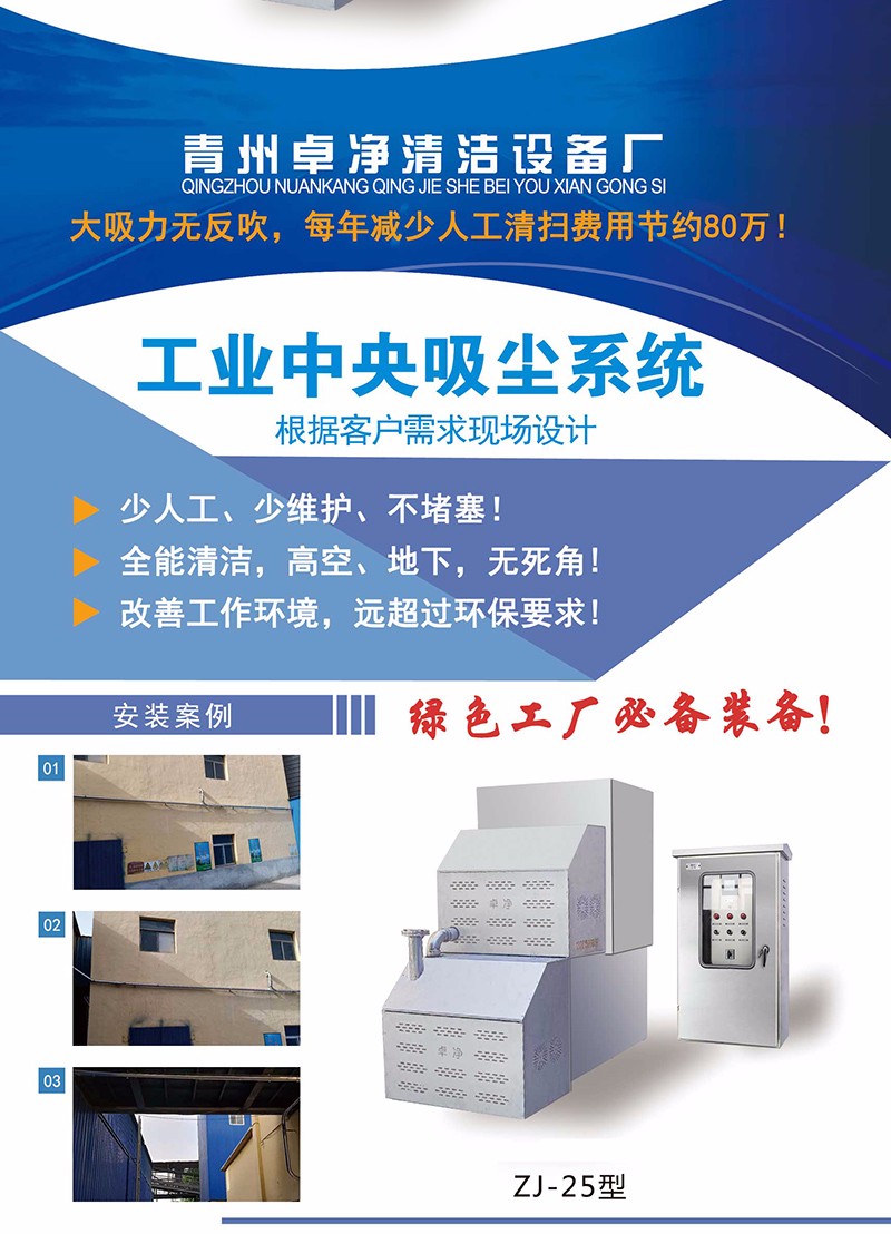 青州卓凈清潔設(shè)備廠創(chuàng)建于2013年,是從事清潔設(shè)備研發(fā)、創(chuàng)新、制造與銷售為一體的高科技現(xiàn)代化公司,主要產(chǎn)品為工業(yè)中央吸塵系統(tǒng)。