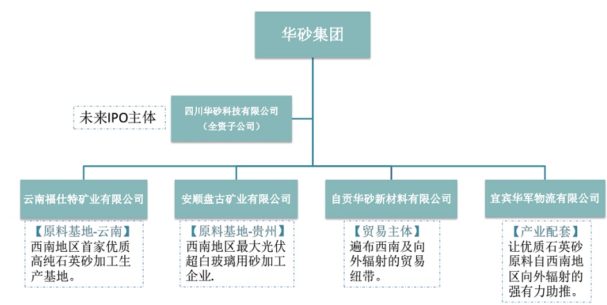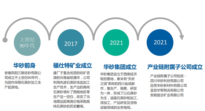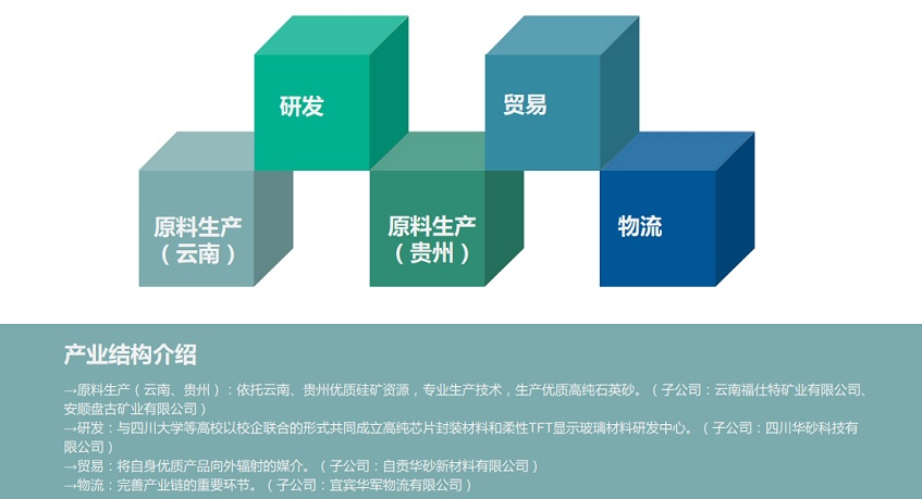 華砂集團集生產(chǎn)、銷售、研發(fā)為一體,形成了以石英砂為 主,涵蓋石英砂原料加工、貿(mào)易、產(chǎn)品研發(fā)及貨物運輸領(lǐng)域的 業(yè)務格局。旗下?lián)碛兴拇ㄈA砂科技有限公司、自貢華砂新材料 公司、云南福仕特礦業(yè)有限公司、安順盤古礦業(yè)有限公司、宜 賓華軍物流有限公司。目前華砂集團已與中國建材,南玻集團, 傳化集團,蜀玻集團,郎酒集團,華興集團,信義玻璃等上市 企業(yè)簽訂或形成戰(zhàn)略合作伙伴關(guān)系。