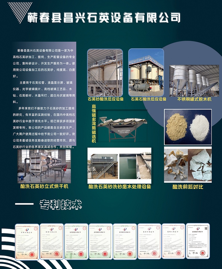 蘄春縣昌興石英設備有限公司是一家為中高檔石英砂加工、提純,生產(chǎn)配套設備的專業(yè)公司,集科研設計、開發(fā)生產(chǎn)服務為一體。