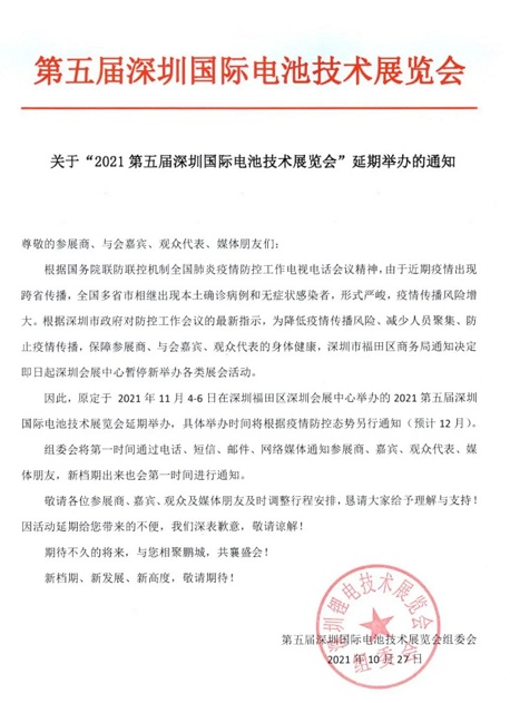 關(guān)于“2021第五屆深圳國際電池技術(shù)展覽會”延期舉辦的通知