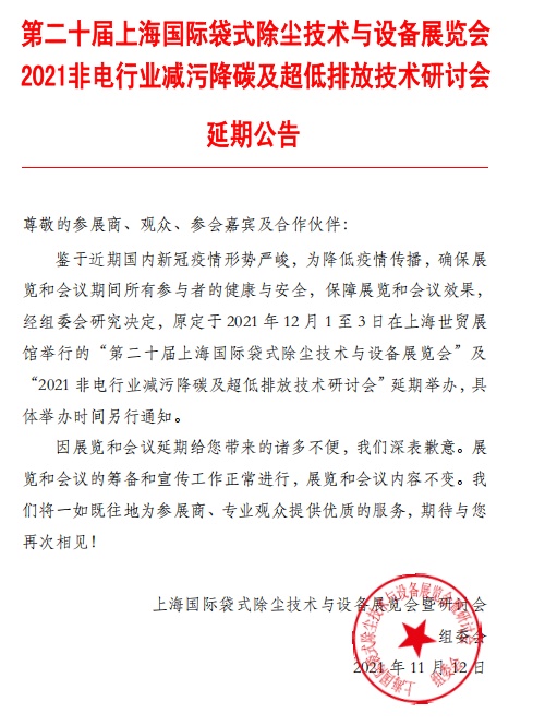 鑒于近期國內(nèi)新冠疫情形勢嚴(yán)峻,為降低疫情傳播,確保展覽和會議期間所有參與者的健康與安全,保障展覽和會議效果,經(jīng)組委會研究決定,原定于2021年12月1至3日在上海世貿(mào)展館舉行的“第二十屆上海國際袋式除塵技術(shù)與設(shè)備展覽會”及“2021 非電行業(yè)減污降碳及超低排放技術(shù)研討會”延期舉辦,具體舉辦時間另行通知。