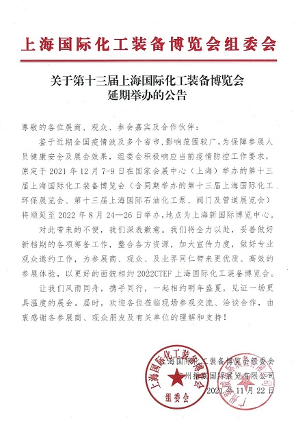 關于第十三屆上海國際化工裝備博覽會延期舉辦的公告