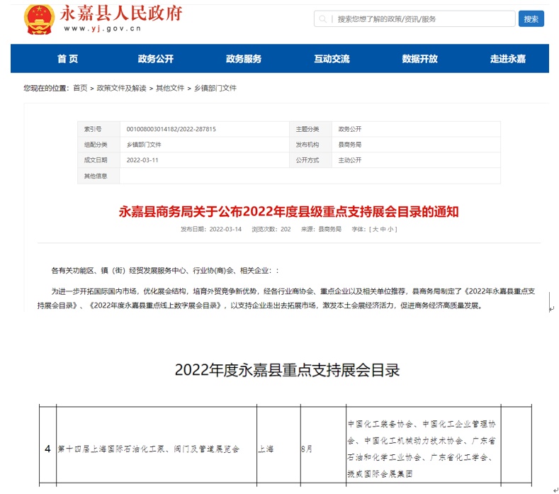 近年來(lái),主辦方不斷整合各方資源,展會(huì)還得到政府的高度支持。3月14日,溫州市永嘉縣商務(wù)局發(fā)布《2022年永嘉縣重點(diǎn)支持展會(huì)目錄》,以支持企業(yè)走出去拓展市場(chǎng),激發(fā)本土?xí)菇?jīng)濟(jì)活力,促進(jìn)商務(wù)經(jīng)濟(jì)高質(zhì)量發(fā)展,第十四屆上海國(guó)際化工泵、閥門及管道展覽會(huì)名列其中。