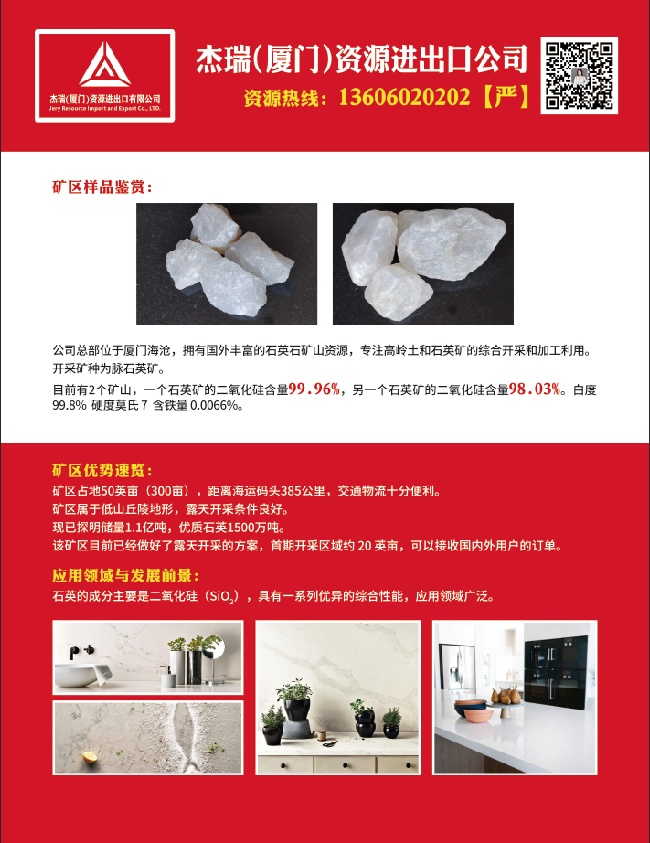 杰瑞(廈門)資源進(jìn)出口公司,公司總部位于廈門海滄,擁有國外豐富的石英石礦山資源,專注高嶺土和石英礦的綜合開采和加工利用。