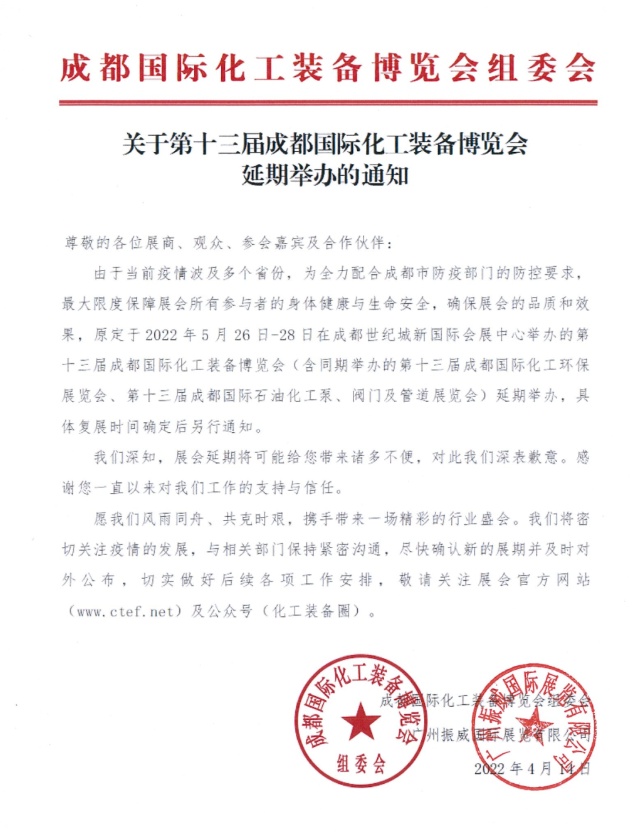 由于當(dāng)前疫情波及多個(gè)省份,為全力配合成都市防疫部門的防控要求,最大限度保障展會(huì)所有參與者的身體健康與生命安全,確保展會(huì)的品質(zhì)和效果,原定于2022年5月26日-28日在成都世紀(jì)城新國際會(huì)展中心舉辦的第十三屆成都國際化工裝備博覽會(huì)(含同期舉辦的第十三屆成都國際化工環(huán)保展覽會(huì)、第十三屆成都國際石油化工泵、閥門及管道展覽會(huì))延期舉辦,具體復(fù)展時(shí)間確定后另行通知。