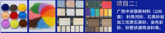 項目二:廣西中涂聯(lián)新材料(100畝) 利用山砂、石英砂巖加工優(yōu)質(zhì)石英砂、染色彩砂、砂壁狀建筑涂料等