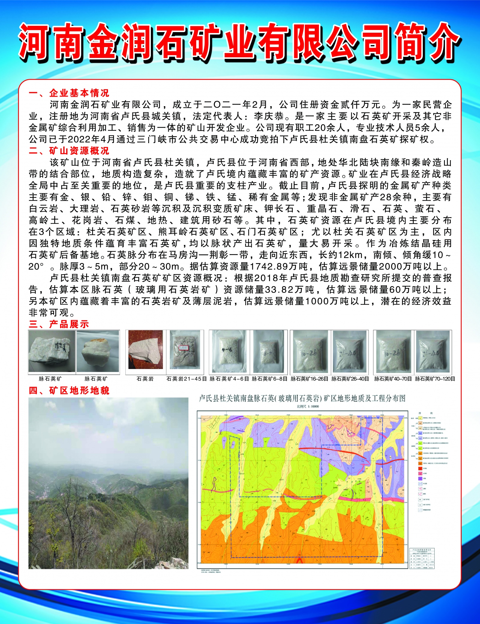 公司現(xiàn)有職工20余人,專業(yè)技術(shù)人員5余人:公司己于2022年4月通過三門峽市公共交易中心成功競(jìng)拍下盧氏縣杜關(guān)鎮(zhèn)南盤石英礦探礦權(quán)。