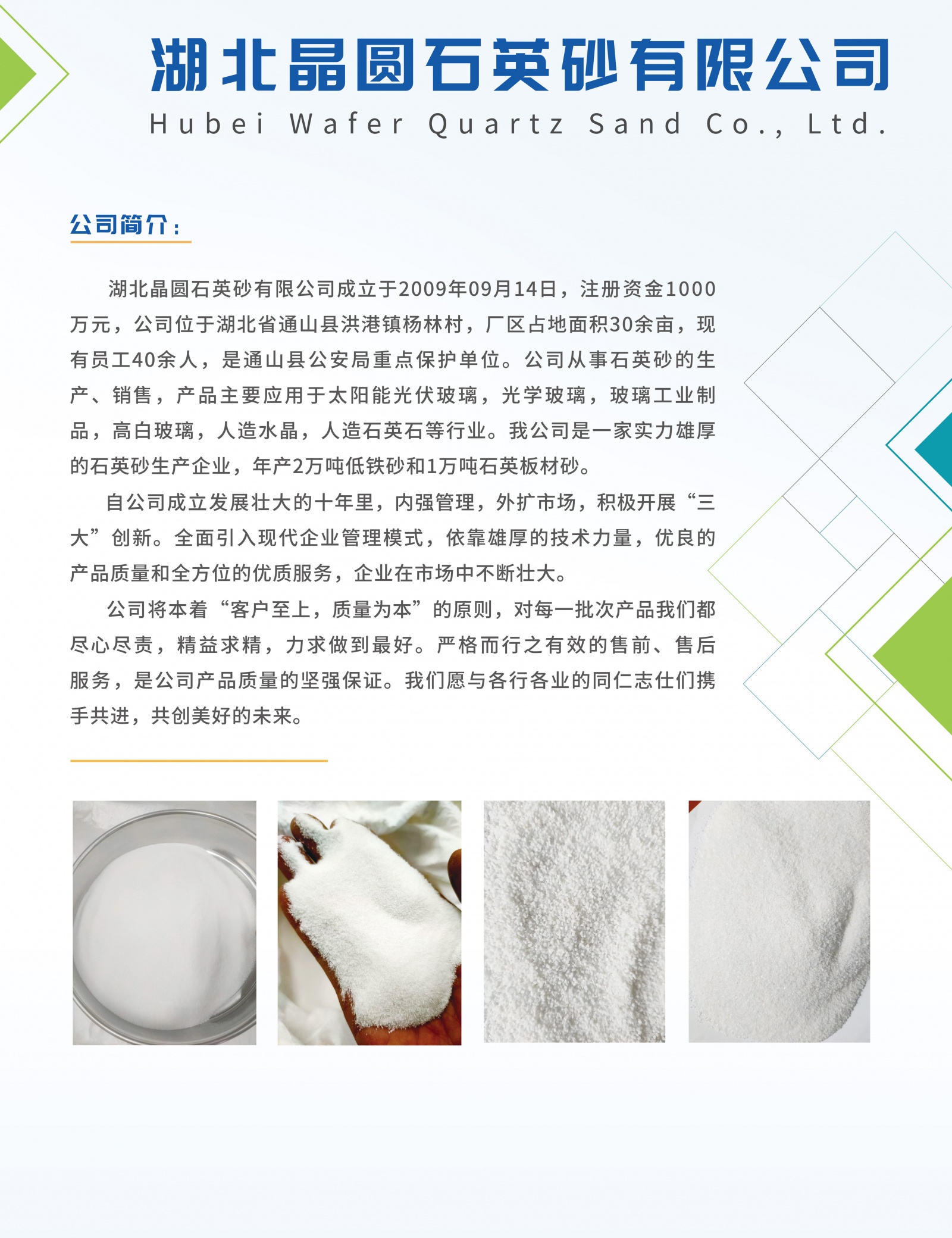 湖北晶圓石英砂有限公司成立于2009年09月14日,注冊(cè)資金1000萬(wàn)元,公司位于湖北省通山縣洪港鎮(zhèn)楊林村,廠區(qū)占地面積100畝,現(xiàn)有員工80余人,是通山縣公安局重點(diǎn)保護(hù)單位。公司從事石英砂的生產(chǎn)、銷售,產(chǎn)品主要應(yīng)用于太陽(yáng)能光伏玻璃,光學(xué)玻璃,玻璃工業(yè)制品,高白玻璃,人造水晶,人造石英石等行業(yè)。我公司是一家實(shí)力雄厚的石英砂生產(chǎn)企業(yè),年產(chǎn)30萬(wàn)噸低鐵砂和10萬(wàn)噸石英板材砂。