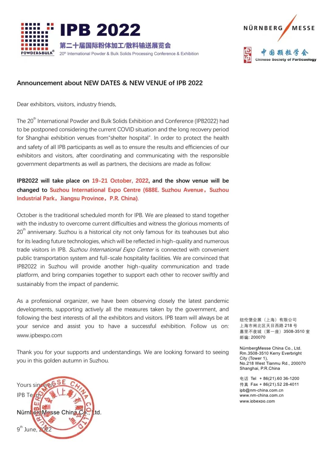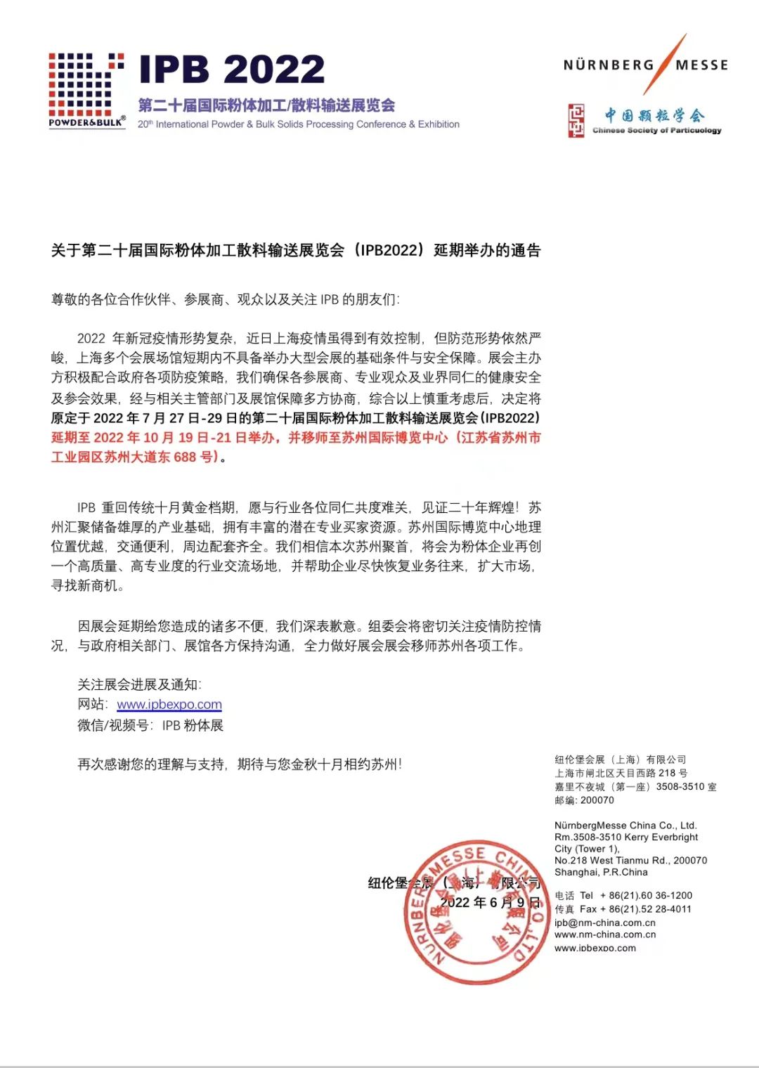 尊敬的各位合作伙伴、參展商、觀眾以及 關(guān)注IPB的朋友們: 2022年新冠疫情形勢復(fù)雜,近日上海疫情雖得到有效控制,但防范形勢依然嚴(yán)峻,上海多個(gè)會(huì)展場館短期內(nèi)不具備舉辦大型會(huì)展的基礎(chǔ)條件與安全保障。展會(huì)主辦方積極配合政府各項(xiàng)防疫策略,我們確保各參展商、專業(yè)觀眾及業(yè)界同仁的健康安全及參會(huì)效果,經(jīng)與相關(guān)主管部門及展館保障多方協(xié)商,綜合以上慎重考慮后,決定將原定于2022年7月27日-29日的第二十屆國際粉體加工散料輸送展覽會(huì)(IPB2022)延期至2022年10月19日-21日舉辦,并移師至蘇州國際博覽中心(江蘇省蘇州市工業(yè)園區(qū)蘇州大道東688號)。 IPB重回傳統(tǒng)十月黃金檔期,愿與行業(yè)各位同仁共度難關(guān),見證二十年輝煌!蘇州匯聚儲備雄厚的產(chǎn)業(yè)基礎(chǔ),擁有豐富的潛在專業(yè)買家資源。蘇州國際博覽中心地理位置優(yōu)越,交通便利,周邊配套齊全。我們相信本次蘇州聚首,將會(huì)為粉體企業(yè)再創(chuàng)一個(gè)高質(zhì)量、高專業(yè)度的行業(yè)交流場地,并幫助企業(yè)盡快恢復(fù)業(yè)務(wù)往來,擴(kuò)大市場,尋找新商機(jī)。 因展會(huì)延期給您造成的諸多不便,我們深表歉意。組委會(huì)將密切關(guān)注疫情防控情況,與政府相關(guān)部門、展館各方保持溝通,全力做好展會(huì)移師蘇州各項(xiàng)工作。 關(guān)注展會(huì)進(jìn)展及通知: 網(wǎng)站:www.ipbexpo.com 微信/視頻號:IPB粉體展 再次感謝您的理解與支持,期待與您金秋十月相約蘇州! 紐倫堡會(huì)展(上海)有限公司 2022年6月9日