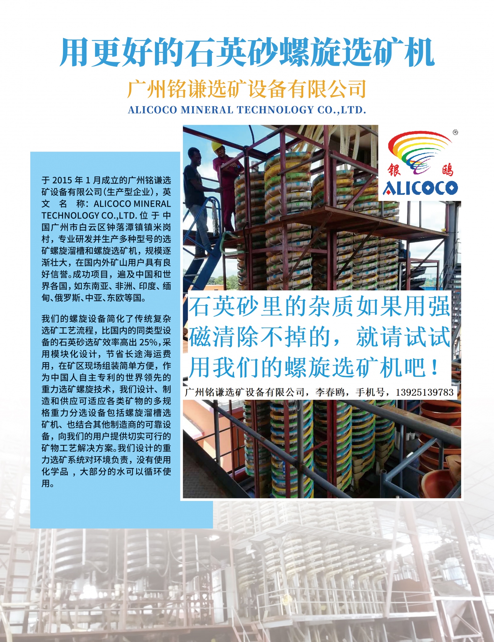 于 2015 年1月成立的廣州銘謙選礦設(shè)備有限公司(生產(chǎn)型企業(yè)),英文名稱:ALICOCO MINERALTECHNOLOGY COLLTD位于中國廣州市白云區(qū)鐘落潭鎮(zhèn)鎮(zhèn)米崗村,專業(yè)研發(fā)并生產(chǎn)多種型號的選礦螺旋溜槽和螺旋選礦機(jī),規(guī)模逐漸壯大,在國內(nèi)外礦山用戶具有良好信譽(yù)。成功項(xiàng)目。遍及中國和世界各國,如東南亞 非洲,印度、緬甸、俄羅斯、中亞、東歐等國。