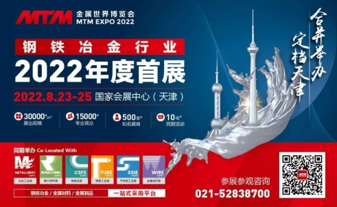 由全聯(lián)冶金商會(huì)、中國(guó)耐火材料行業(yè)協(xié)會(huì)、中國(guó)鋼結(jié)構(gòu)協(xié)會(huì)鋼管分會(huì)、天津市金屬材料行業(yè)協(xié)會(huì)、天津市線材制品行業(yè)協(xié)會(huì)、天津市鑄鍛行業(yè)協(xié)會(huì)、上海市金屬學(xué)會(huì)、上海鋼管行業(yè)協(xié)會(huì)、寶山鋼鐵股份有限公司等單位共同主辦的“2022MTM金屬世界博覽會(huì)·天津”將于2022年8月23-25日在國(guó)家會(huì)展中心(天津)舉辦。