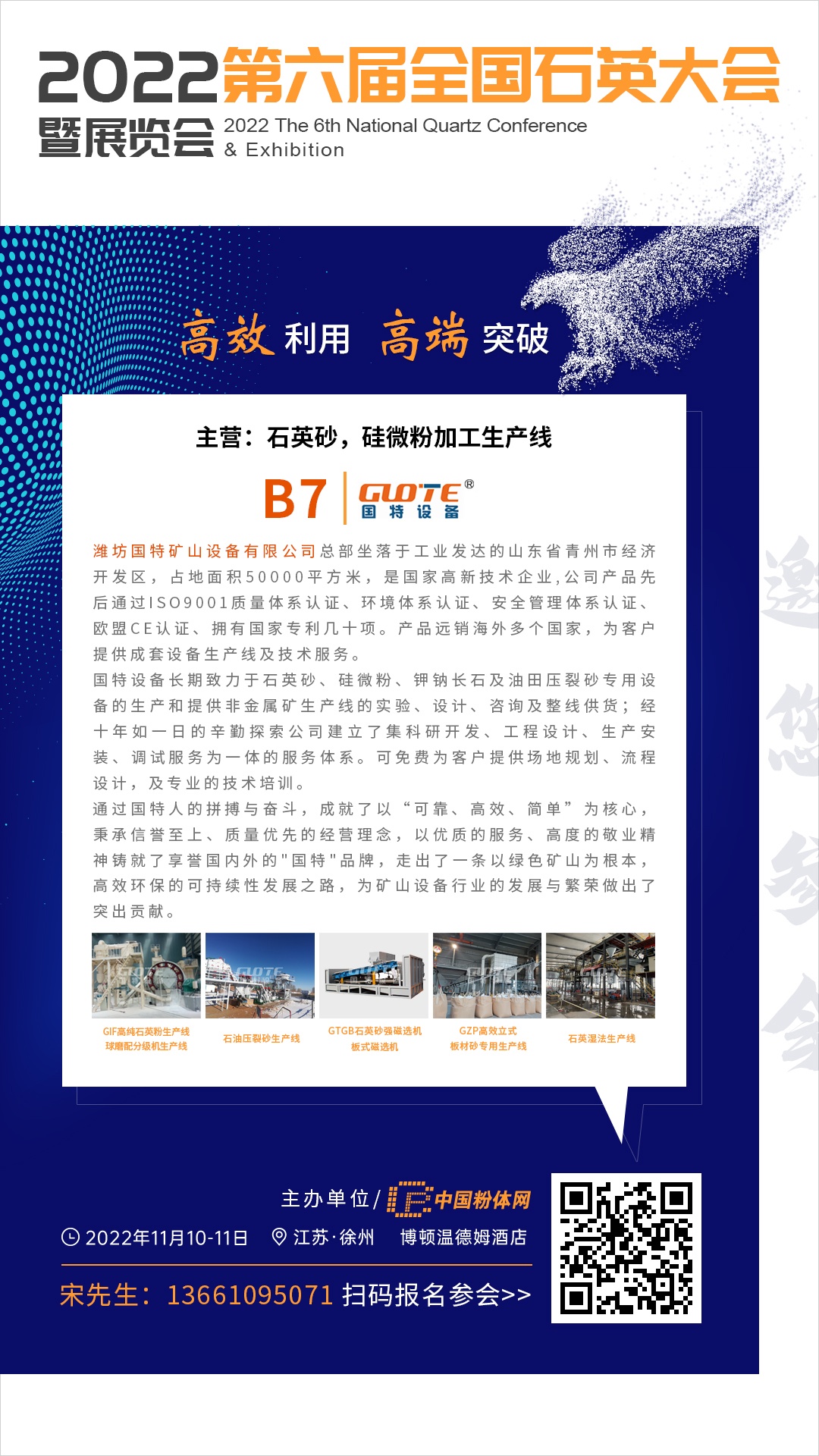 由中國粉體網(wǎng)主辦的“2022(第六屆)全國石英大會”將于11月10-11日在江蘇·徐州舉辦,濰坊國特邀您一同參加。