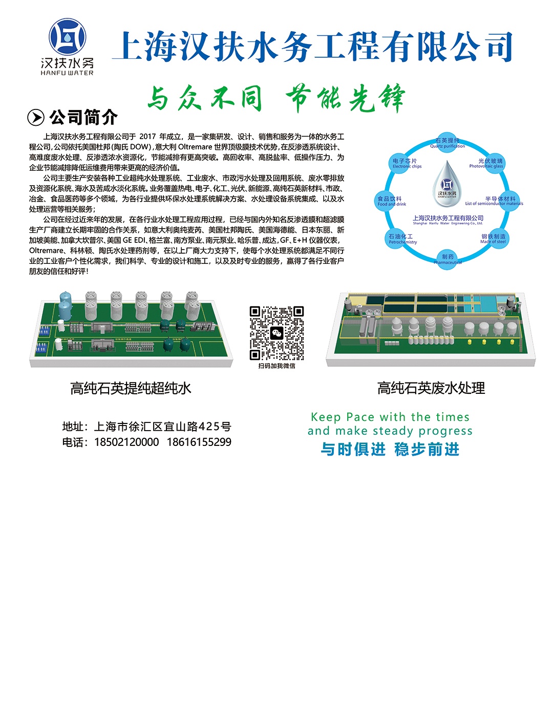 上海漢扶水務(wù)工程有限公司成立于2017年,主要經(jīng)營水利水電建設(shè)工程,工業(yè)純水廢水水理工程,水處理設(shè)備安裝,空氣凈化系統(tǒng)安裝,水處理領(lǐng)域內(nèi)技術(shù)研發(fā)技術(shù)服務(wù),高難度廢水處理中水回用,水處理系統(tǒng)托管運維,反海透濃鹽水資源化節(jié)能減公司依托意大利奧純賽芮公司美國杜邦陶氏膜技術(shù)優(yōu)勢,在反滲透系統(tǒng)設(shè)計,高難度廢水縮,反滲透濃鹽水資源化節(jié)能感排有更高的突破在系統(tǒng)設(shè)計中充分發(fā)揮技術(shù)優(yōu)勢,高回收率,脫鹽率,低運行壓力,在濃鹽水回收中可以達到80%回收率,系統(tǒng)運行穩(wěn)定,節(jié)能減排明顯,經(jīng)效益高,公司八字方針好用、耐用、節(jié)能、減排頭企業(yè)節(jié)能減排降低運維費用提高水利用率做出獻,漢扶水務(wù)只做優(yōu)質(zhì)水務(wù)工程上海漢扶水務(wù)與國內(nèi)知名環(huán)保企業(yè)環(huán)球水務(wù)工程集團有限公司合作,業(yè)務(wù)拓展輻射面有全國各地,技術(shù)服務(wù)快捷高效,環(huán)球水務(wù)工程集團,是中國制造環(huán)保水處理最早的專業(yè)廠家之一,集設(shè)計、生產(chǎn)制造、工程總承包大型環(huán)境工程集團公司,公司擁有環(huán)保工程設(shè)計乙級資質(zhì),建筑安裝工程壹級,機電安裝工程壹級資質(zhì),國家亮新技術(shù)企業(yè),中國環(huán)保百強企業(yè)。
