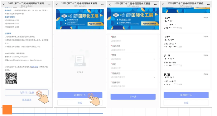 1.完成預(yù)登記后,在觀眾注冊(cè)頁(yè)面點(diǎn)擊【為同行人注冊(cè)】按鈕即可成為團(tuán)長(zhǎng); 2.點(diǎn)擊“新增同行人”,填寫信息,每完成一位同行人信息完成后即算一位團(tuán)員; 3.發(fā)動(dòng)您的人脈,邀請(qǐng)至少4位石油和化工相關(guān)行業(yè)的專業(yè)人士。