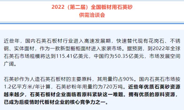 6月28號(hào),“2022(第二屆)全國(guó)板材用石英砂供需洽談會(huì)”將在廣東·佛山南海保利皇冠假日酒店舉行,華建硅砂邀您一同參加。展位號(hào):D8企業(yè)介紹華建硅砂由長(zhǎng)期從事石英砂石深加工的專(zhuān)家、企業(yè)家組成。華建硅