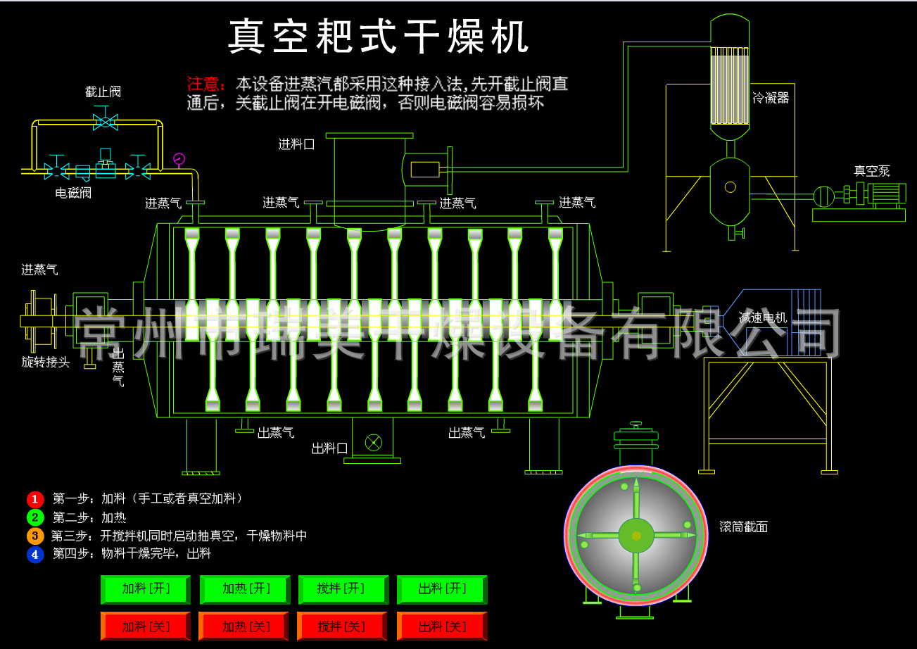 本機(jī)采用大面積夾層加熱方式,傳熱面大,熱效率高。本機(jī)設(shè)置攪拌,使物料在簡(jiǎn)內(nèi)形成連續(xù)循環(huán)狀態(tài),進(jìn)一步提高了物料受熱的均勻度。本機(jī)設(shè)置攪拌,從而可順利進(jìn)行漿狀,膏狀,糊狀物料干燥。采用**兩級(jí)減速機(jī)構(gòu)傳動(dòng),降低功率的同時(shí)增大了扭力。特殊設(shè)計(jì)的出料閥,可以保證罐內(nèi)無(wú)攪拌死角。