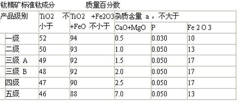 鈦精礦新的標(biāo)準(zhǔn)按鈦成分的不同分為6個等級,其規(guī)格分別如下: