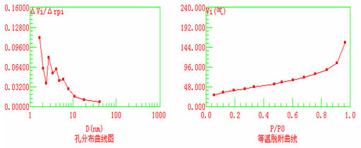 該機具有多種的測試功能,包括快速測定比表面、BET比表面測定、等溫吸(脫)附曲線測定、孔徑分布測定、總孔體積及平均孔徑測定;該儀器的測試結果與進口的靜態(tài)氮吸附儀的對應性相當好 ,經(jīng)中國計量院的檢測,其重復精度非常高,通過一段時間的實際應用,已經(jīng)得到廣大用戶的認可,這是我國動態(tài)氮吸附儀具有歷史性意義的重大突破。該機的外形及典型的測試結果如圖所示。