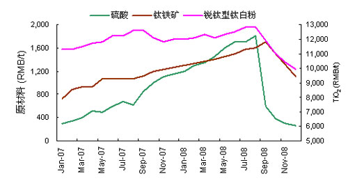據(jù)統(tǒng)計(jì),2008年中國鈦白粉全年產(chǎn)量78.7萬噸,較2007年大幅下降約21.1%,市場表觀消費(fèi)量96.3萬噸,較2007年下跌約15.2%。硫酸等原材料價(jià)格在前三個(gè)季度的大幅上漲促使行業(yè)整體盈利水平大幅下探,與此同時(shí),全球金融危機(jī)又使得主要下游行業(yè)如油漆涂料、塑料產(chǎn)品等的客戶需求增速放緩,這兩大因素共同作用直接導(dǎo)致了行業(yè)整體需求量下滑。