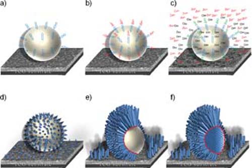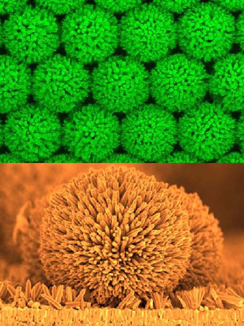 瑞士聯(lián)邦材料測試與開發(fā)研究所(簡稱:EMPA)的研究員成功使用簡單的電化學(xué)方法在聚苯乙烯微珠顆粒上生長出海膽形狀的納米結(jié)構(gòu)。海膽刺狀結(jié)構(gòu)由氧化 鋅納米線組成。這種結(jié)構(gòu)化的表面可以被用來提高光伏產(chǎn)品的轉(zhuǎn)化效率。賦予材料新特性的工藝往往復(fù)雜且重復(fù)性差,但令人感到驚訝的是,科學(xué)家報告的新工藝不僅使用了廉價的原材料,而且不需要昂貴的設(shè)備。