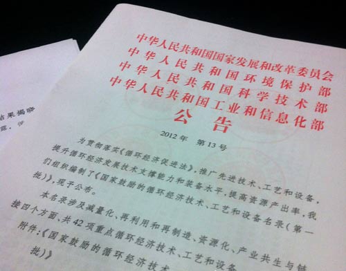 6月1日,國家發(fā)展改革委、環(huán)境保護(hù)部、科技部、工業(yè)和信息化部等四部門聯(lián)合發(fā)布了《國家鼓勵的循環(huán)經(jīng)濟(jì)技術(shù)、工藝和設(shè)備名錄(第一批)》(以下簡稱《名錄》)。