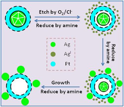 在中國科學院過程工程研究所多相復雜系統(tǒng)國家重點實驗室支持下,楊軍研究員的科研小組發(fā)現(xiàn),呈多面體形貌的Ag能夠在核殼就夠納米材料中由內(nèi)向外擴散(如圖)。根據(jù)這一特殊現(xiàn)象,研究人員使用Ag作為犧牲模板,發(fā)展了一個易于實現(xiàn)且具備普遍意義的方法制備空心和搖鈴型金屬納米材料。在該方法中,首先在有機相制備具有單一或多個殼層的核殼結(jié)構(gòu)納米材料,Ag組分位于內(nèi)核或內(nèi)殼層,然后使用二水合雙(對-磺酰苯基)苯基膦化二鉀鹽(BSPP)將內(nèi)核或內(nèi)殼層中的Ag除去,得到具有空心或搖鈴結(jié)構(gòu)的金屬納米材料。BSPP可以和Ag/Ag+配位絡(luò)合,形成溶于水的絡(luò)合物并加速Ag由核殼結(jié)構(gòu)金屬納米顆粒內(nèi)向外擴散的過程,使之可在24~48小時內(nèi)完成。
