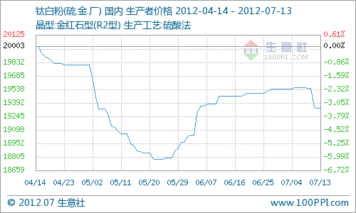 以國內(nèi)市場(chǎng)走貨量較大的硫酸法金紅石型鈦白粉為例,由圖中可以看出,本周(7月9-13日)鈦白粉價(jià)格總體出現(xiàn)回調(diào),從本周一的19553元/噸到周末的19331元/噸,跌幅為1.13%,生產(chǎn)商價(jià)格高位僵持開始松動(dòng)。