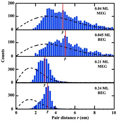 圖2. MEG和BEG表面Cs原子最近鄰距離統(tǒng)計柱狀圖,其中黑線為無相互作用隨機分布曲線。