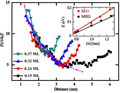 圖3. BEG表面Cs-Cs原子間平均相互作用勢,虛線對應(yīng)0.4e電荷轉(zhuǎn)移誘導(dǎo)靜電勢曲線。插圖是ab initio 計算結(jié)果。