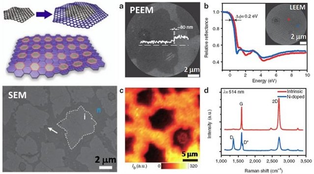 石墨烯在光電技術(shù)等領(lǐng)域有潛在的重要應(yīng)用,而構(gòu)建P-N結(jié)是實(shí)現(xiàn)許多光電器件應(yīng)用的核心,因此構(gòu)建石墨烯的光電功能器件必須在保證石墨烯質(zhì)量的前提下,實(shí)現(xiàn)高可控性和均一性的穩(wěn)定摻雜。北京大學(xué)化學(xué)與分子工程學(xué)院劉忠范-彭海琳課題組根據(jù)材料生長中調(diào)制摻雜的原理,提出了具有高遷移率、摻雜區(qū)域可控的石墨烯的調(diào)制摻雜生長方法,實(shí)現(xiàn)了“馬賽克”結(jié)構(gòu)的石墨烯P-N結(jié)材料的規(guī)模制備,并將其用于高性能光電轉(zhuǎn)換器件。由于對(duì)石墨烯進(jìn)行氮攙雜能夠有效降低表面功函數(shù),其與本征石墨烯區(qū)域在PEEM成像中具有較大的襯度差異,因此PEEM可以作為一個(gè)有效的表面研究方法表征具有此類結(jié)構(gòu)的石墨烯表面。