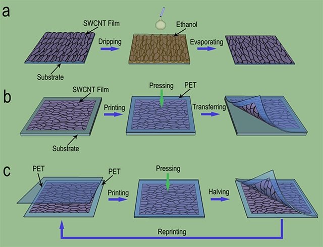碳納米管透明薄膜是替代氧化銦錫(ITO)導(dǎo)電薄膜的理想材料,更重要的是有望廣泛地應(yīng)用于柔性電子器件。利用浮動催化法直接制備的自支撐碳納米管薄膜具有獨特的二維連續(xù)網(wǎng)絡(luò)結(jié)構(gòu),從而具有優(yōu)異的電學(xué)和力學(xué)性能(Nano. Lett. 2007, 7, 2307)。但是由于受其制備條件的約束,小于100 納米的自支撐透明導(dǎo)電薄膜難以利用此方法直接來獲得,這限制了其進一步的應(yīng)用。為了解決這一問題,他們發(fā)展了傳統(tǒng)的轉(zhuǎn)移印刷技術(shù),提出了一種基于靜電吸附的減薄碳納米管薄膜的方法——重復(fù)轉(zhuǎn)移印刷法,通過利用離子靜電吸附效應(yīng)提高低表面能基底的表面能,使得碳納米管薄膜可以從高表面能的基底轉(zhuǎn)移到原本表面能較低的基底上。