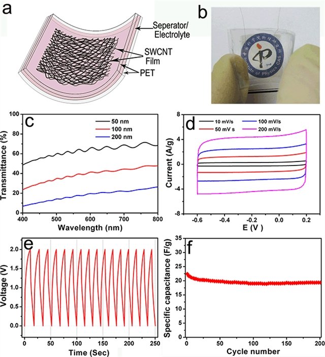 中科院物理研究所/北京凝聚態(tài)物理國家實驗室(籌)先進材料與結(jié)構(gòu)分析實驗室“納米材料與介觀物理”課題組多年來一直致力于碳納米管薄膜的制備、物性與應(yīng)用研究,取得了一系列成果( Adv. Mater. 2009 , 21 , 603; Nano Lett. 2009 , 9 , 2855; Nanoscale 2011 , 3 , 3731; Nano Lett. 2011 , 11 , 4636; Energ. Environ. Sci. 2011 , 4 , 1440)。最近,該課題組牛志強博士、周維亞研究員、解思深院士等與本所清潔能源實驗室黃學(xué)杰研究組馮國星博士、李泓研究員、胡勇勝研究員,新加坡南洋理工大學(xué)材料科學(xué)與工程學(xué)院陳曉東教授和澳大利亞臥龍崗大學(xué)智能聚合物研究所陳俊博士合作,充分利用直接生長的自支撐柔性碳納米管薄膜獨特的連續(xù)網(wǎng)絡(luò)結(jié)構(gòu)、高電導(dǎo)率、高力學(xué)強度、高透光率等特點,研究了這種碳納米管薄膜在儲能器件和透明柔性電子學(xué)等領(lǐng)域的應(yīng)用。