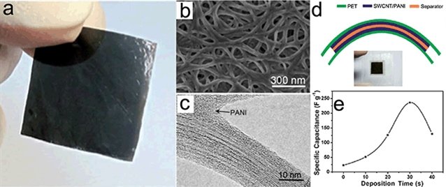 圖3 (a)超薄碳納米管/聚苯胺異質(zhì)結(jié)構(gòu)薄膜的光學(xué)照片;(b)SEM圖像和(c)TEM圖像;(d)柔性透明碳納米管超級電容器的示意圖及光學(xué)照片;(e)沉積聚苯胺不同時間碳納米管/聚苯胺薄膜超級電容器電極的質(zhì)量比電容。