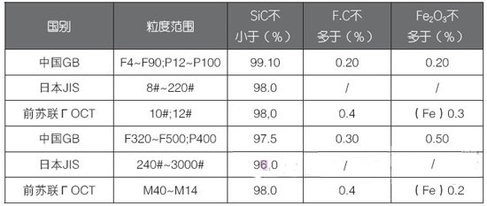 表1 中國國家標(biāo)準(zhǔn)與日本、前蘇聯(lián)國家標(biāo)準(zhǔn)綠碳化硅化學(xué)成分對比