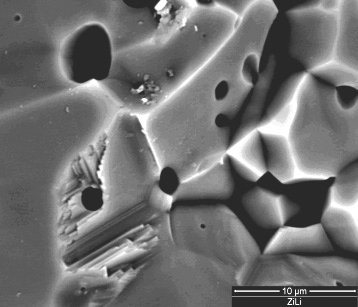 圖中給出了浙江自立股份有限公司生產(chǎn)的板狀剛玉的顯微結構圖?梢钥闯觯旱捅断聞傆窬Я4笮≡50~200μm左右,晶內(nèi)含有大量微米級氣孔,晶粒延臺階狀生長,使板狀剛玉具有優(yōu)異的熱震穩(wěn)定性,從而在耐火材料行業(yè)大規(guī)模應用。