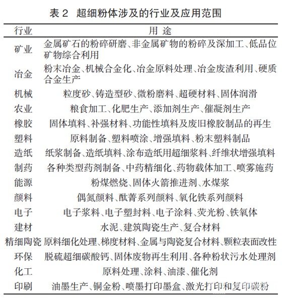 超細粉體工業(yè)是多學(xué)科的組合,超細粉體幾乎應(yīng)用于國民經(jīng)濟的所有部門,表2 列出了超細粉體涉及的行業(yè)及應(yīng)用范圍。
