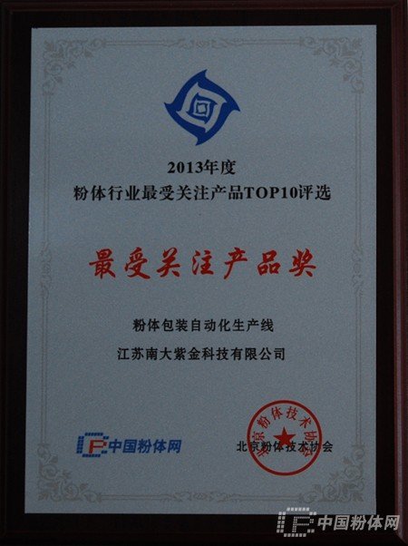 近日,由中國粉體網(wǎng)舉辦的2013年度粉體行業(yè)“最受關(guān)注產(chǎn)品獎”評選結(jié)果揭曉。江蘇南大紫金科技有限公司生產(chǎn)的粉體包裝自動化生產(chǎn)線獲得“最受關(guān)注產(chǎn)品獎”的殊榮。在參評的兩項重要指標中排名靠前,很受消費者親睞!