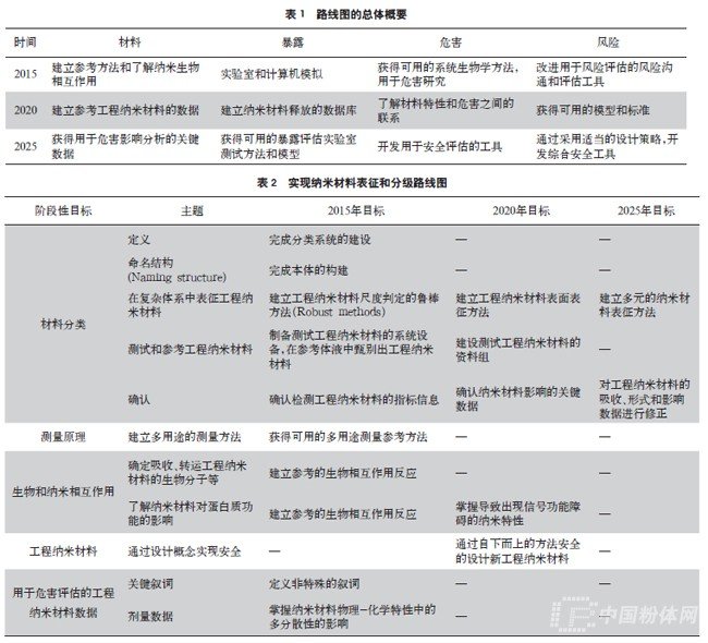 該部分主要包括材料分類、測量原理、生物和納米相互作用、工程納米材料、用于危害評估的工程納米材料數(shù)據(jù)等領域。材料分類領域的主要目標是完成工程納米材料的定義、構建本體1、確定表征和測試納米材料的方法;測量方法領域的主要目標是建立多用途的測量方法等;生物和納米相互作用的主要目標是了解納米材料與生物的相互作用,建立相應的參考數(shù)據(jù);工程納米材料領域的主要目標是安全制造納米材料等;用于危害評估的工程納米材料數(shù)據(jù)的主要目標是獲取相應的的危害數(shù)據(jù)等,具體路線圖見表2。