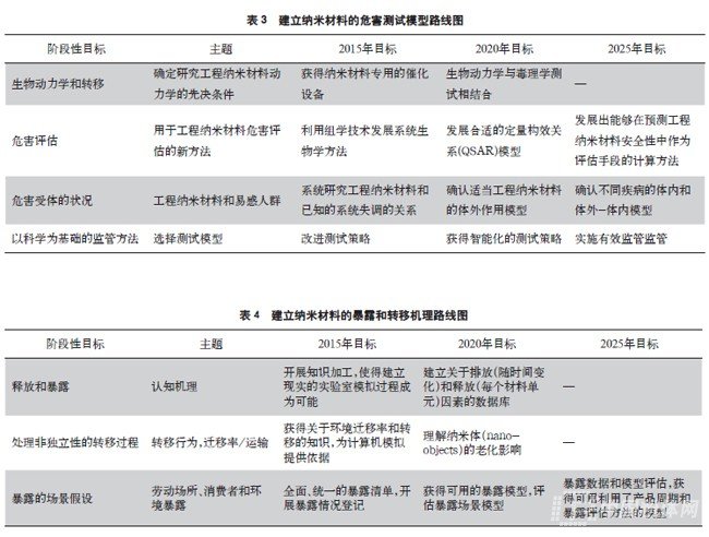 該部分主要包括生物動力學和轉移、危害評估、危害受體的狀況、工程納米材料、以科學為基礎的監(jiān)管方法等領域,具體路線圖見表3。生物動力學和轉移領域的主要目標是了解納米材料的生物動力學特征和轉移的情況;危害評估的主要目標是確定評估的方法;危害受體狀況的主要目標是確定易感人群;以科學為基礎的監(jiān)管方法領域的主要目標是確定納米危害測試的模型。
