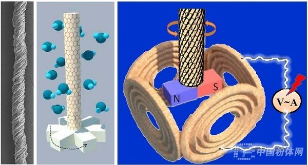 圖示:螺旋石墨烯纖維在濕度改變下帶動磁鐵旋轉產生電能