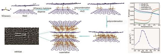 針對上述挑戰(zhàn),謝毅教授課題組首先提出了一種新的空間限域生長策略制備石墨烯基超晶格材料的方法,獲得了完美堆垛的單層石墨烯-單層氧化釩-單層石墨烯……的超晶格結(jié)構(gòu),克服了傳統(tǒng)生長超晶格材料的缺點。在這種石墨烯基超晶格材料中,石墨烯不僅可以作為一個獨特的空間限域反應(yīng)器使釩氧層沿著石墨烯面二維生長,而且可以作為電子給體,引起釩氧層結(jié)構(gòu)的結(jié)構(gòu)重組,降低生成高對稱性釩氧骨架的生成能。他們與國家同步輻射實驗室韋世強(qiáng)教授課題組合作,利用同步輻射X-射線吸收精細(xì)結(jié)構(gòu)譜對該超晶格的精細(xì)結(jié)構(gòu)進(jìn)行了詳細(xì)表征。結(jié)果表明,超晶格中的釩氧層的對稱性明顯大于在自由空間得到的VO2(B),并導(dǎo)致了一級可逆相轉(zhuǎn)變的出現(xiàn)及由之產(chǎn)生的磁熱效應(yīng),這種相轉(zhuǎn)變類似于VO2(M)-VO2(R)相變過程中對稱性由高到低的轉(zhuǎn)變。由于超晶格中二維的單疇結(jié)構(gòu)和石墨烯層的應(yīng)力作用,這個轉(zhuǎn)變過程中的磁熵變值相比于VO2(M)-VO2(R)相變的磁熵變值提高了8倍。重要的是,這種柔性的超晶格納米片材料是用低成本的溶液法制得,避免了傳統(tǒng)超晶格材料制備中復(fù)雜的轉(zhuǎn)移過程,因此適應(yīng)于各種功能器件的組裝,有望加速超晶格材料的實際應(yīng)用。