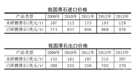 我國作為主要的滑石出口國,從2009年至今,我國滑石產(chǎn)品出口價格有了較大幅度的提高。根據(jù)我國海關(guān)統(tǒng)計數(shù)據(jù),2013年滑石塊出口平均價格207.37美元/t,滑石粉出口平均價格270.48美元/t。近年來,我國進(jìn)口滑石塊的價格呈上漲趨勢,我國滑石粉產(chǎn)品進(jìn)口價格大幅度增長。