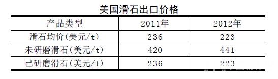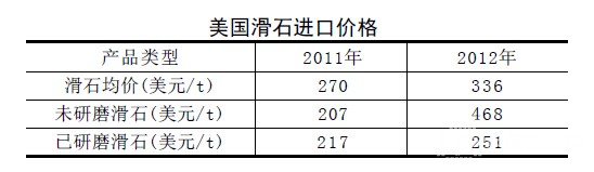 從上表可以看出,2012年進(jìn)口滑石價格與2011年相比有所增長。進(jìn)口未研磨滑石的平均單價與2011年相比有較大的增長。美國進(jìn)口已研磨滑石的單價呈上漲趨勢,主要是由于從幾個貿(mào)易合作伙伴進(jìn)口的數(shù)量增加。