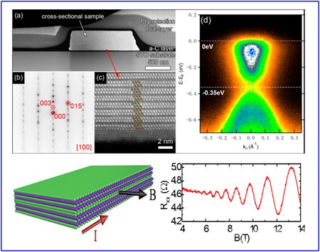 圖1 上:Bi2Se3納米帶的球差矯正透射電鏡的原子分辨結(jié)構(gòu)圖像以及室溫下測量的角分辨光電子譜ARPES (Nano Letters DOI: 10.1021/nl501276e,2014);下:起源于Bi2Se3納米帶側(cè)壁(Sidewall)表面態(tài)輸運的SdH振蕩(Scientific Reports 4,3817,2014)