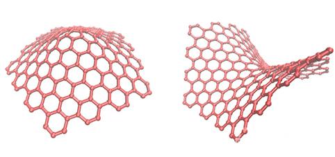 左為含有孤立五邊形的錐形石墨烯片,右為含有孤立七邊形的馬鞍形石墨烯片