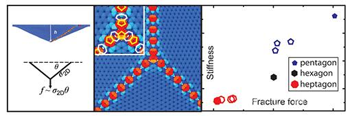 左圖為缺陷幾何效應(yīng)對石墨烯力學(xué)響應(yīng)的影響示意;中圖為石墨烯中晶界處五、七邊形拓?fù)淙毕莘植;右圖為納米壓痕測量力學(xué)響應(yīng)時局部缺陷類型與其剛度、強(qiáng)度的關(guān)聯(lián)。圖中的五、七邊形符號對應(yīng)在三晶界交匯處的缺陷類型,六邊形為單晶石墨烯的數(shù)據(jù)。