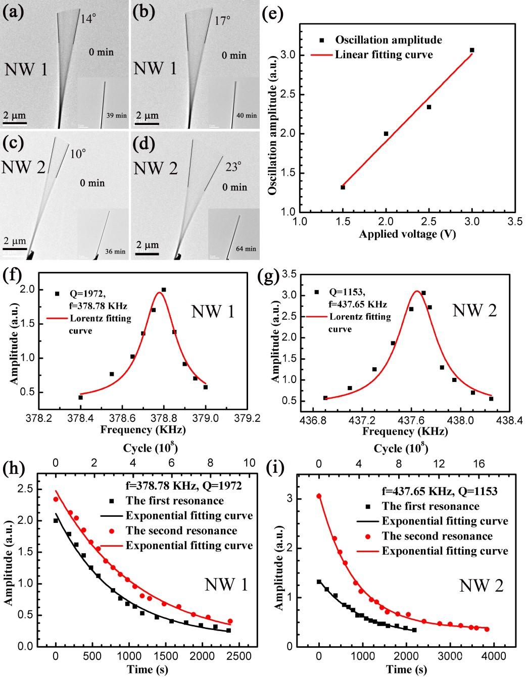 在張躍教授的指導(dǎo)下,李培峰與中科院物理所的合作者利用原位TEM機(jī)械共振,研究了ZnO微/納米線在高周應(yīng)變下的疲勞行為。系統(tǒng)研了ZnO微/納米線的彈性模量隨直徑的變化以及ZnO微/納米線共振振幅在阻尼效應(yīng)作用下隨共振時間及周次衰減的區(qū)別。ZnO微/納米線經(jīng)過108−109周次共振都顯示了良好的疲勞性能,而遭受電子束輻照10 min后的ZnO納米線共振幾秒后即發(fā)生斷裂,這在國際上尚屬首次發(fā)現(xiàn)。