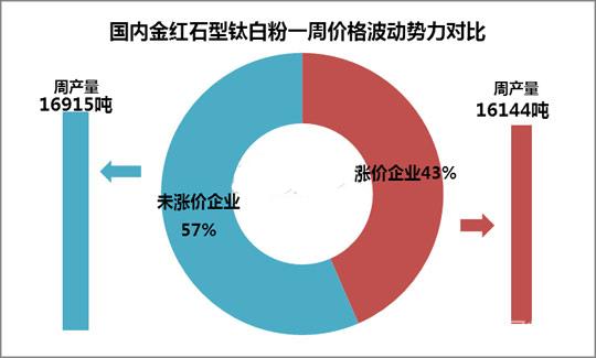 由以上數(shù)據(jù)可見,采集規(guī)模以上金紅石型鈦白粉生產(chǎn)企業(yè)樣本數(shù)量為23家,其中漲價數(shù)量10家,未漲價企業(yè)數(shù)量13家,未漲價企業(yè)數(shù)量相對較多。如果按照產(chǎn)能及開工率核算來看,本周鈦白粉產(chǎn)量中,漲價產(chǎn)量為16143.7噸,未漲價產(chǎn)量為16915.1噸,基本持平。分析可見,本輪國內(nèi)金紅石型鈦白粉漲價與未漲價的雙方實力對比基本持平;厥2014年鈦白粉的六輪漲價,無一不是四川龍蟒帶動領(lǐng)漲,而到了2015年,為何出現(xiàn)了四川龍蟒未漲,而已有半數(shù)漲價的情況?分析認(rèn)為,鈦白粉漲與不漲,歸根結(jié)底還是市場說了算,雖然部分龍頭企業(yè)憑借規(guī)模優(yōu)勢話語權(quán)較強,但在目前行業(yè)整合、集中度不斷提升的背景下,其后的佰利聯(lián)、中核鈦白等規(guī)模也在不斷提升,勢必將會逐步爭奪更多的定價話語權(quán)。單從本輪行情來看,市場供需基本面及當(dāng)前價位實際上是能夠支撐價格上行,但是迫于部分企業(yè)出于維系客戶保證出貨質(zhì)量方面考慮,價格仍難實現(xiàn)整體全上漲。后期來看,鈦白粉漲價仍將由市場主導(dǎo),預(yù)計中短線仍存在一定上行趨勢,金紅石型鈦白粉主流商談價格有望逐步向12000元/噸及以上水平靠攏。
