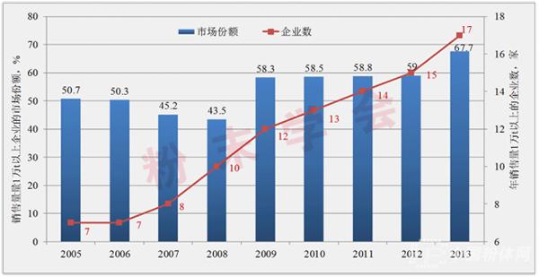 2008年以后不少大企業(yè)開(kāi)始投資擴(kuò)大產(chǎn)能,并引進(jìn)新技術(shù)改進(jìn)生產(chǎn)工藝,企業(yè)最大產(chǎn)能達(dá)到15萬(wàn)t/a。經(jīng)過(guò)2009~2012年的建設(shè),2013年這些新建產(chǎn)能全面釋放,年銷售量1萬(wàn)t/a以上的企業(yè)所占市場(chǎng)份額達(dá)到75.3%,企業(yè)數(shù)也由2006年的7家增加到17家,意味著粉末聚酯行業(yè)產(chǎn)業(yè)集中度已經(jīng)很高。