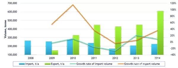 中國粉體網(wǎng)訊 2014年,中國GDP總值高達到63.65萬億人民幣,但GDP增長率從2013年的7.7%滑落至7.4%,中國政府同時也將2015年的GDP增長目標定為7.0%,中國經(jīng)濟進入了穩(wěn)增長的發(fā)展階段。同時,2014年的國內(nèi)的房地產(chǎn)行業(yè)及涂料行業(yè)因終端市場需求不足陷入低迷,鈦白粉行業(yè)也受到波及,市場價格在2014年年底出現(xiàn)大幅度下滑,開拓國外市場成為中國鈦白粉企業(yè)發(fā)展的關鍵。2014年,中國鈦白粉的出口量同比增長35.36%,創(chuàng)下歷史新高60.85萬噸,主要出口地有:美國,巴西,韓國,印度等多個國家,其中出口至中東,歐洲地區(qū)的增速最快。